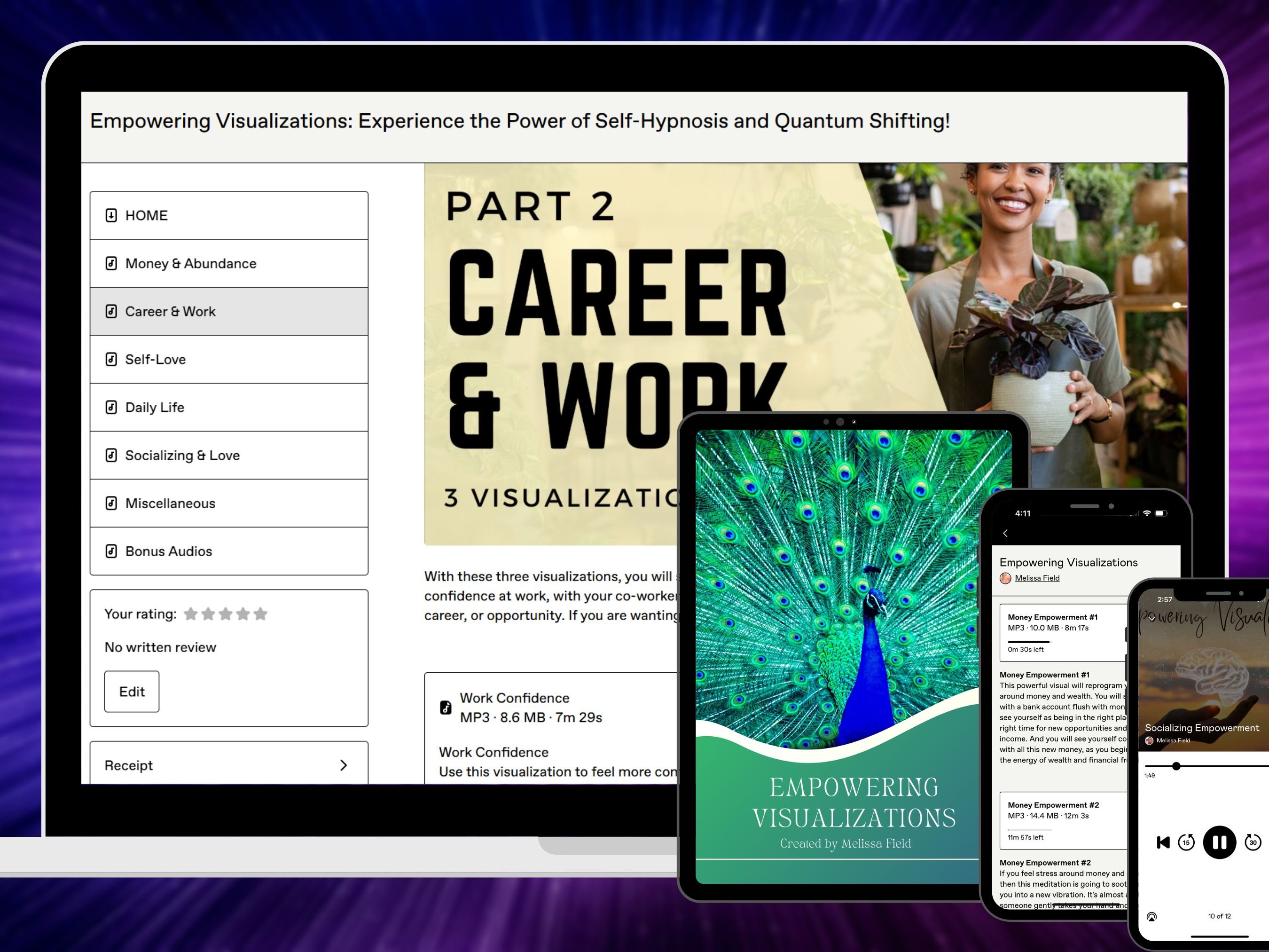 This one is short and simple — perfect for daily use — but your full package includes a rich library of deeper journeys. Most audios are around 8 minutes, designed to fit easily into your day, while a few longer visualizations (up to 25 minutes) offer a more immersive, transformative experience when you’re ready to go deeper.